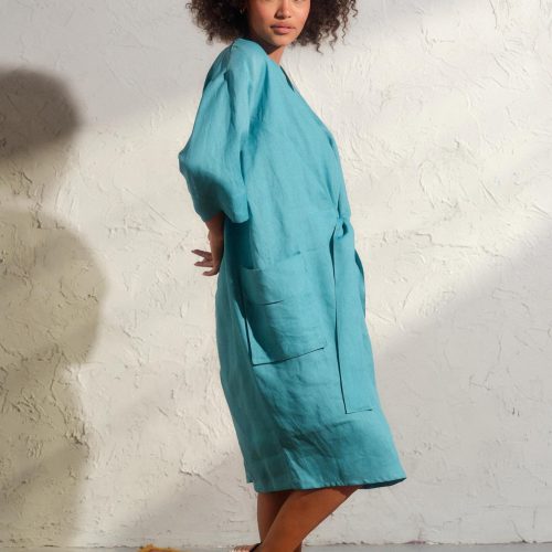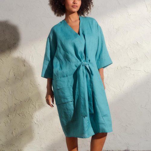 Blue Green Linen Dress With Ribbon Organic Clothing