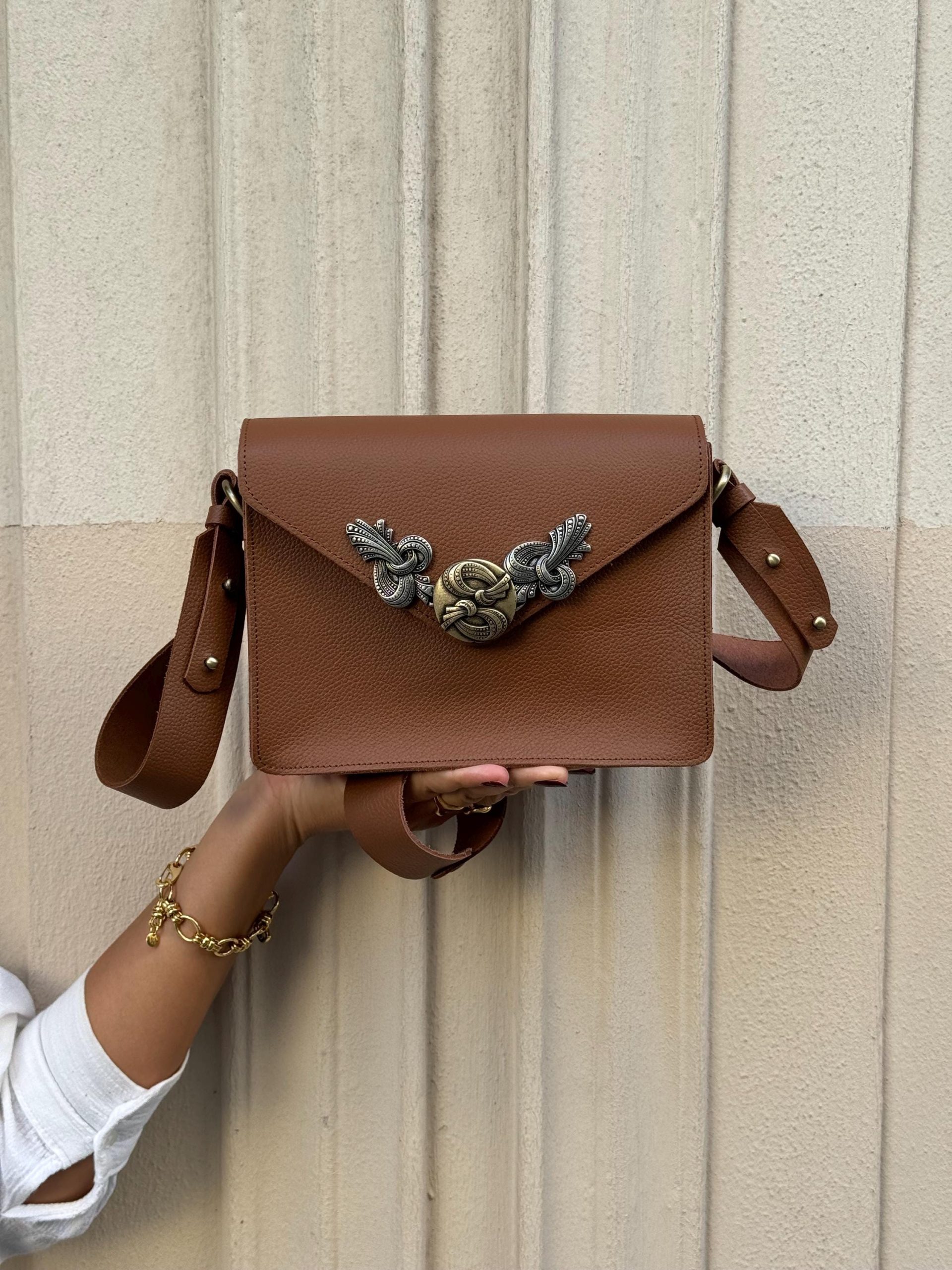 Experience luxury with the Brown Leather Shoulder Bag, a timeless masterpiece handcrafted to perfection. Made from rich, high-quality leather, this bag exudes sophistication and charm. Its classic design is elevated by a unique boho buckle, adding a touch of modernity. Equipped with a convenient crossbody strap and secure magnetic closure, this bag offers functionality without compromising style. Elevate your outfit with this exclusive accessory from us Store.