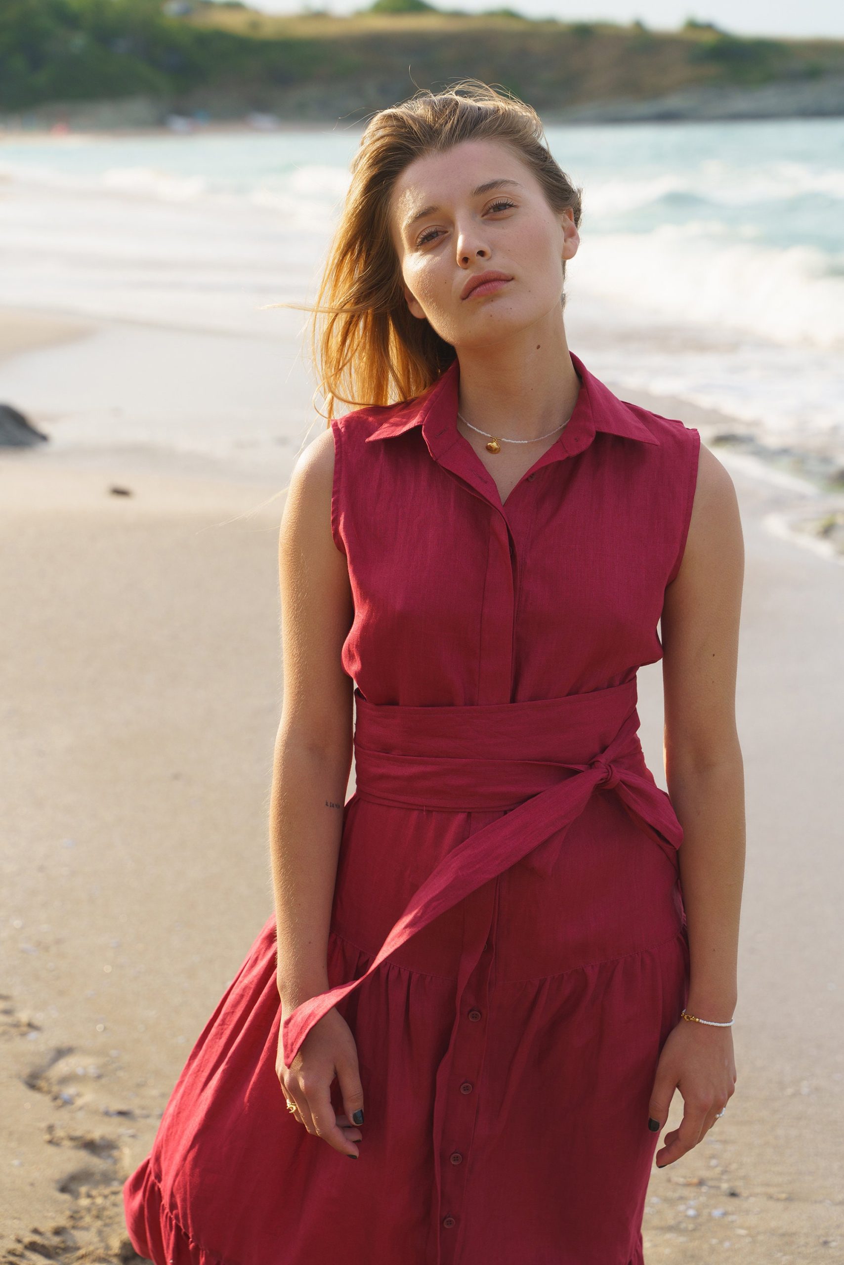 Our model is wearing Burgundy Summer linen dress, size M.
