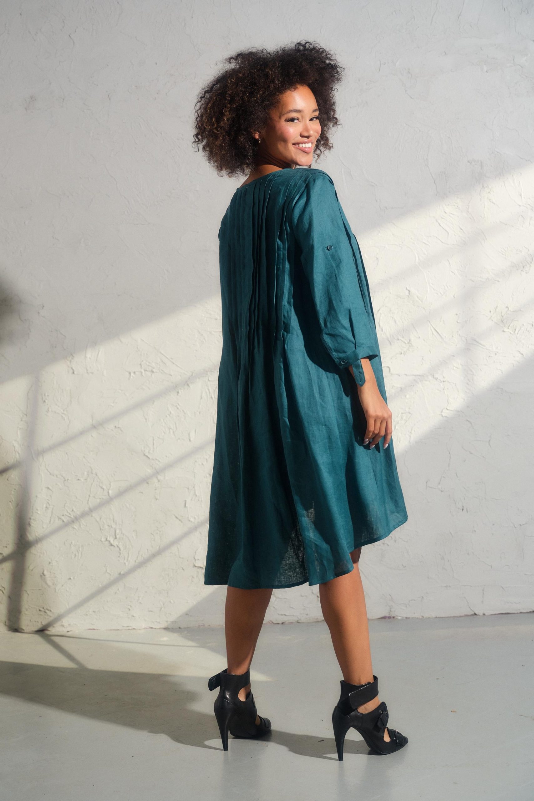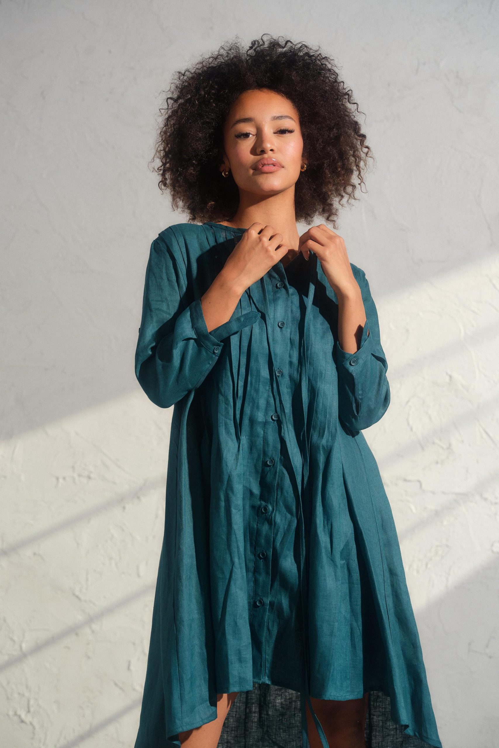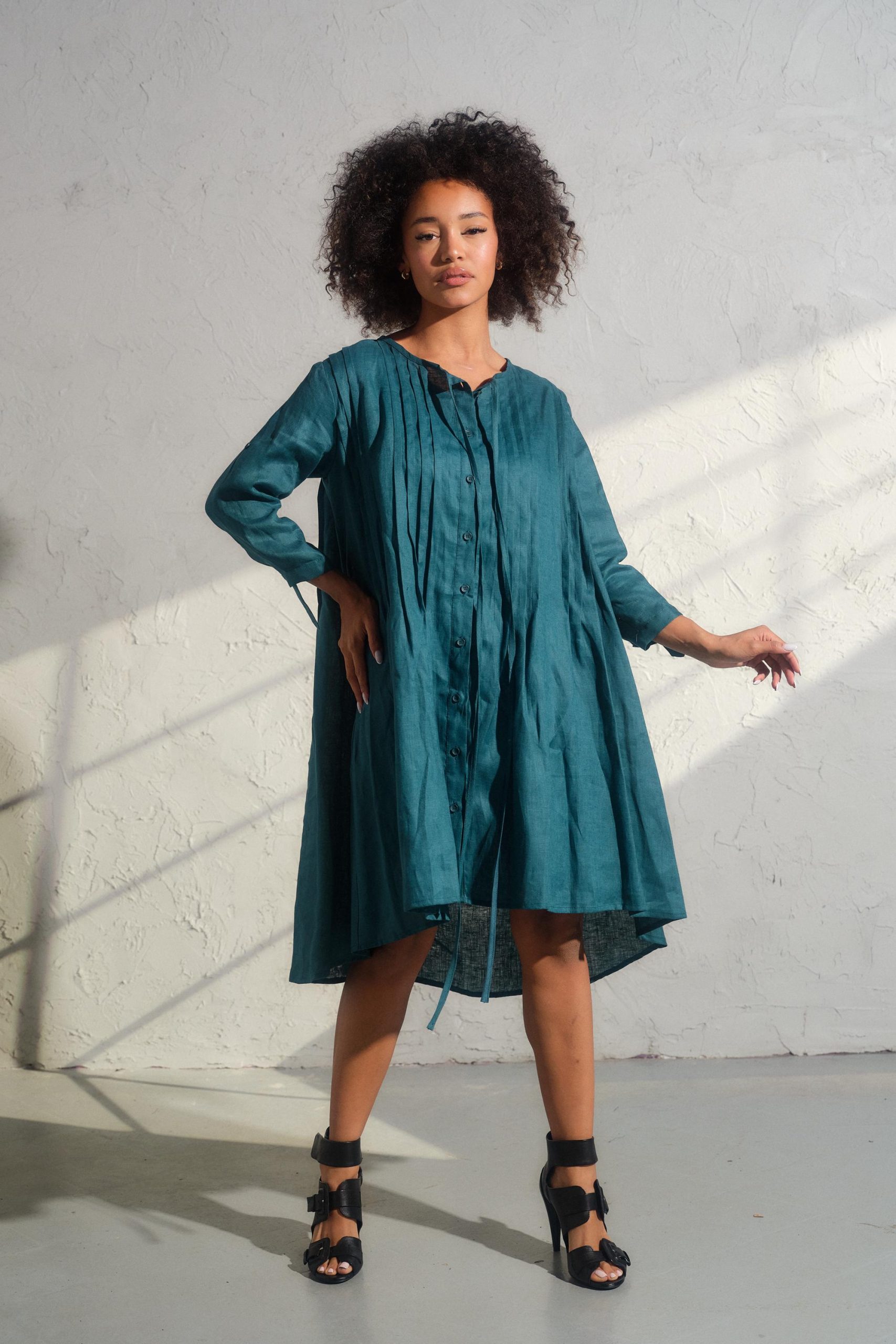 Embrace the spirit of the free-spirited woman and make a bold statement with our Asymmetrical Linen Dress. Consult our size chart to discover your ideal fit, and let your inner creativity soar with each wear. (Model wears size M)