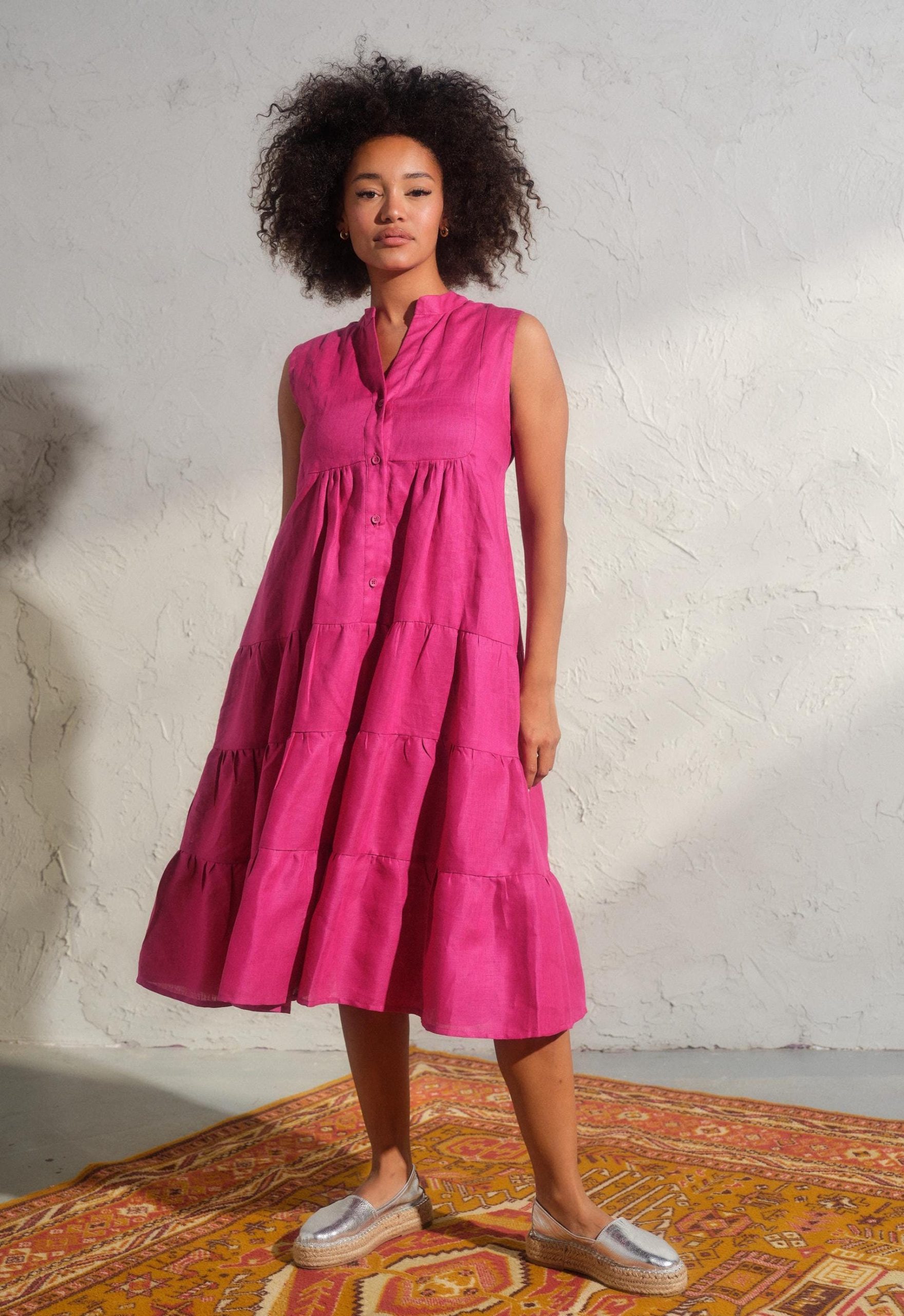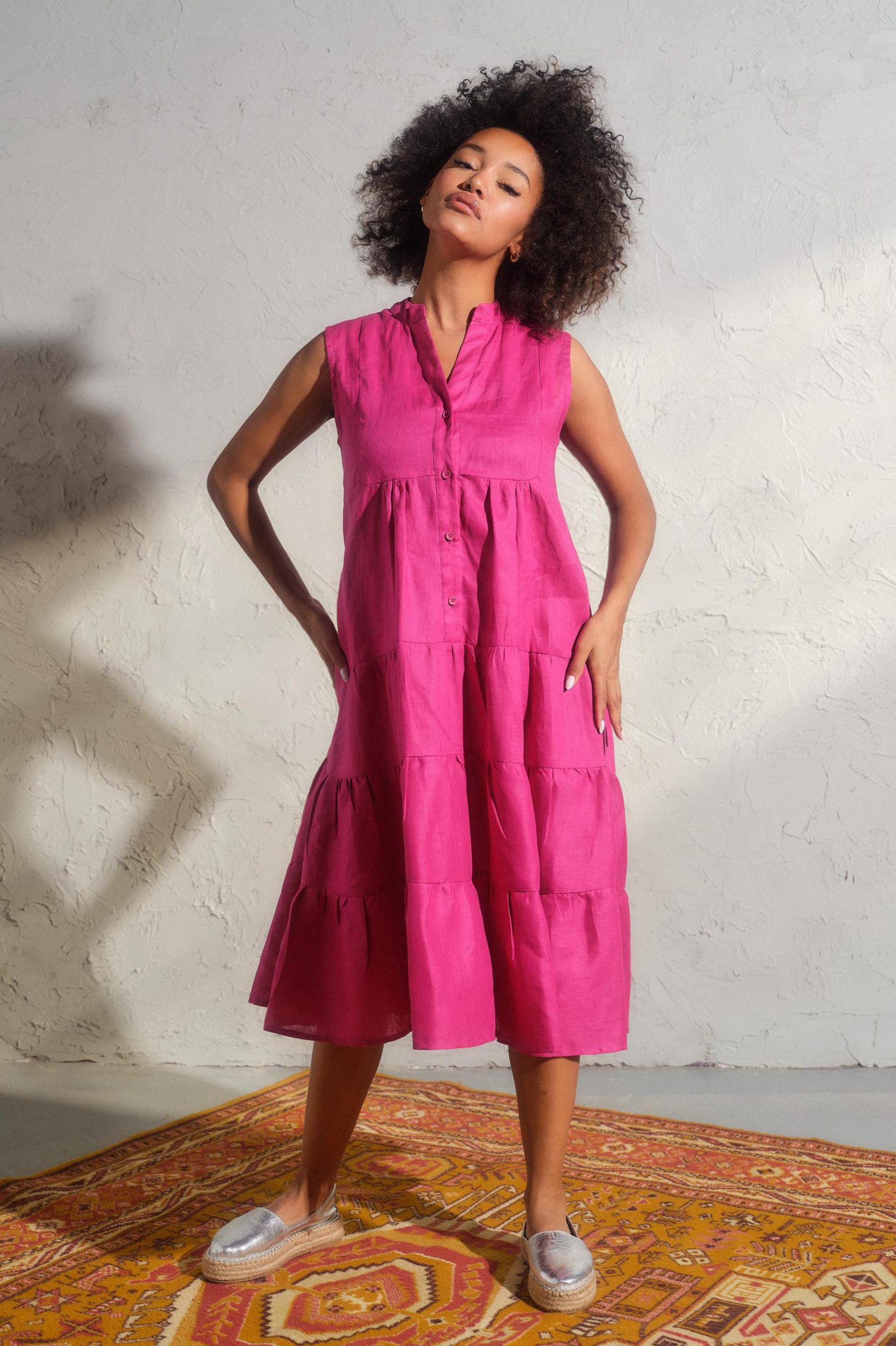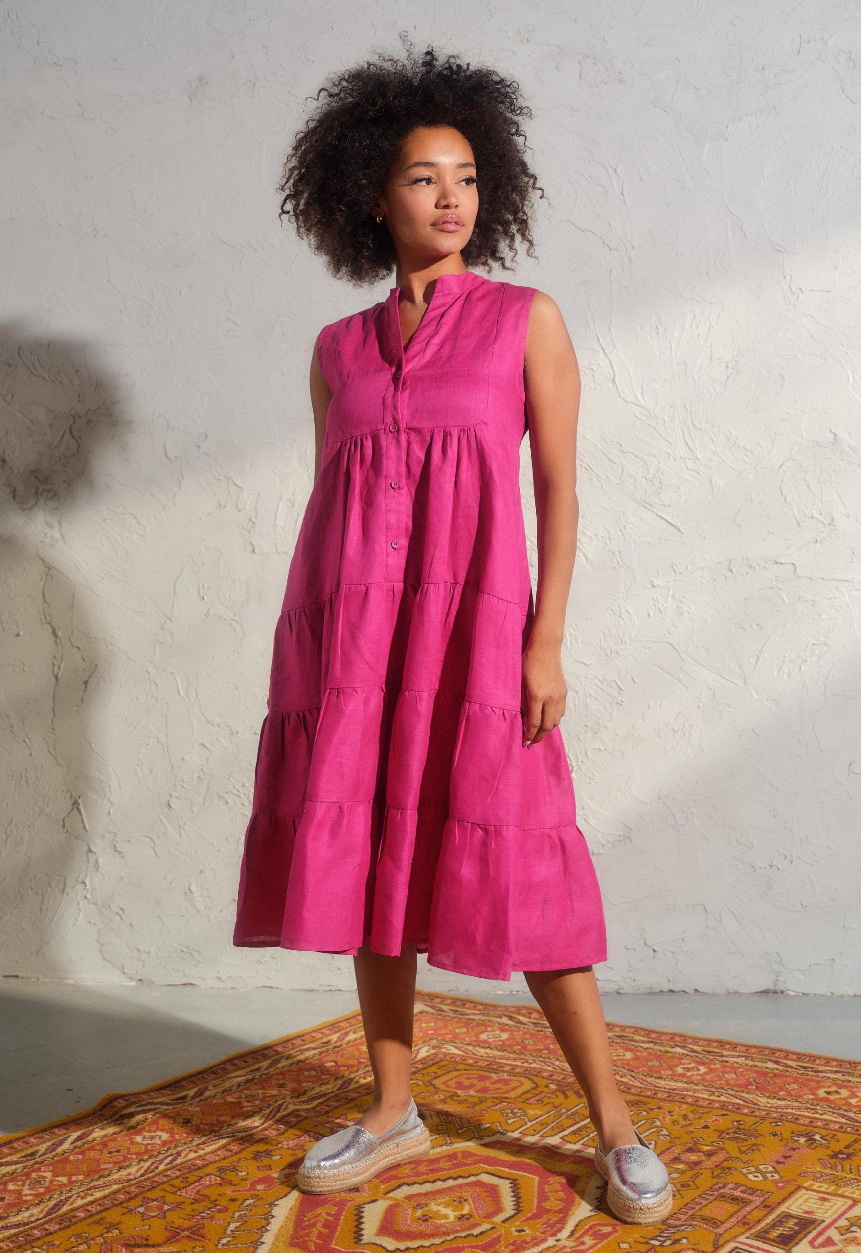Designed with a below-the-knee length, it features a flattering A-shape silhouette, a V-neckline with buttons, and practical pockets. The sleeveless design and loose fit ensure maximum comfort in warm weather, while its versatile style pairs beautifully with espadrilles, sneakers, or sandals for a variety of occasions.