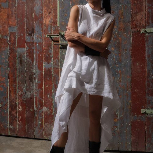 The white summer linen dress is an extraordinary avant garde piece, featuring shorter asymmetrical front that flows down your back, creating beautiful waves.